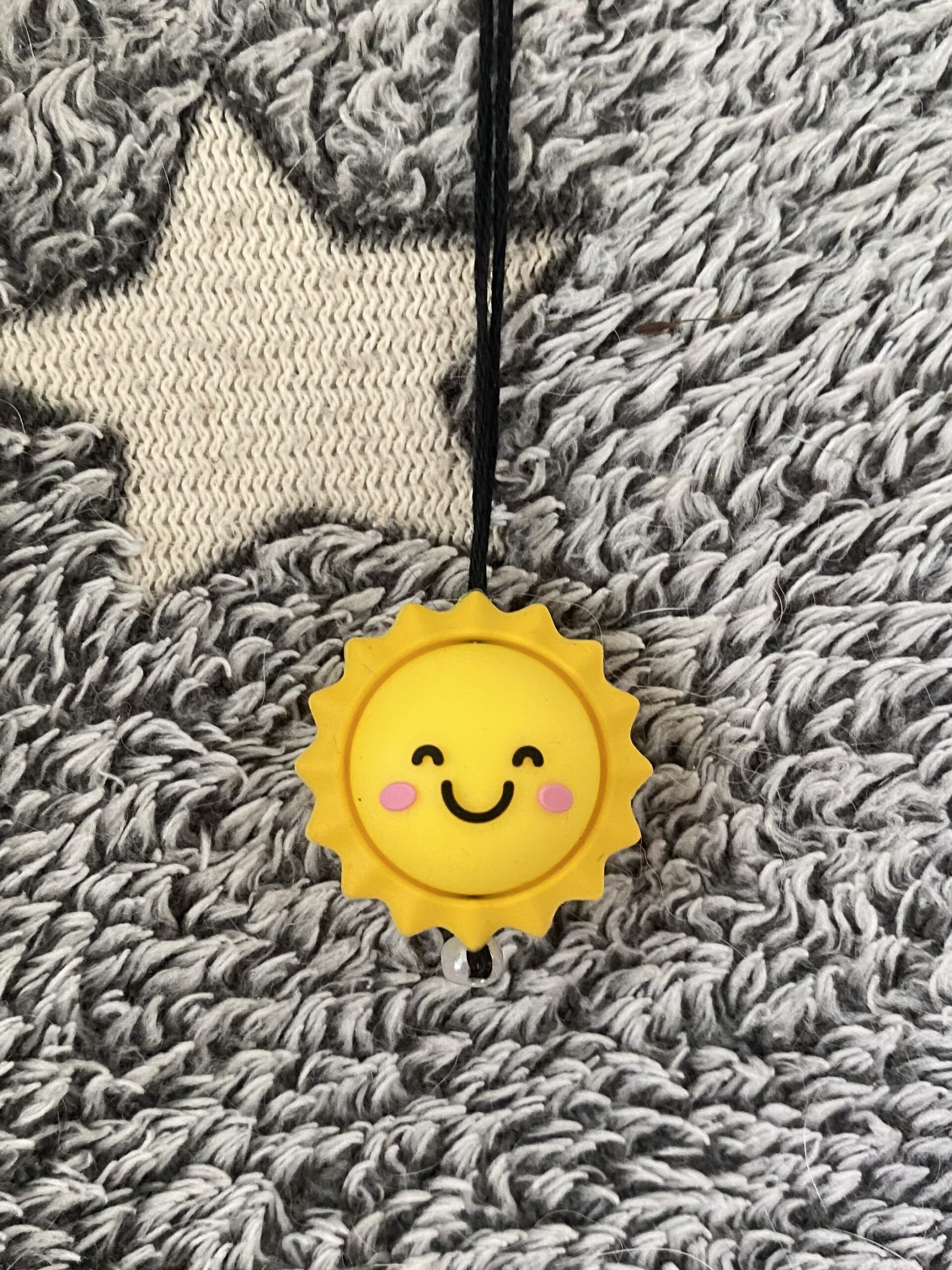 Un collier à mâchouiller, en forme de soleil souriant. La longueur du collier est réglable ! Chaque perle est en silicone de qualité alimentaire